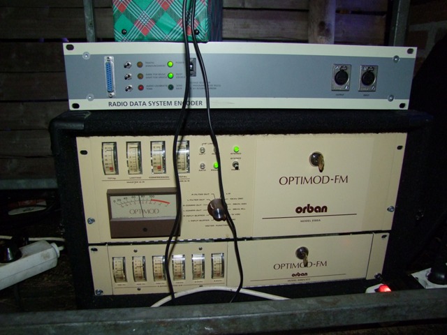 Helaas staat de mast niet bij de studio. Deze staat elders en heeft een hoogte van een kleine 65 meter met erin 4 breedbandantennes van de 3-sterrenparade. Het vermogen van 7 kW komt uit een RVR-set.