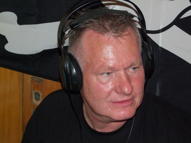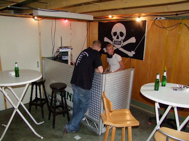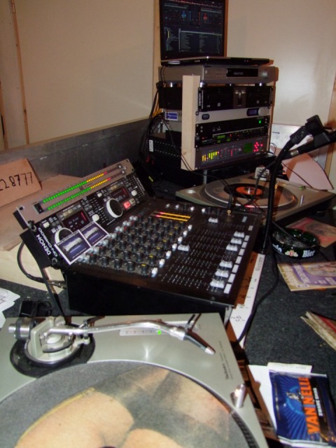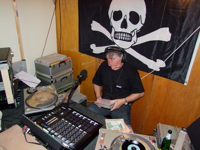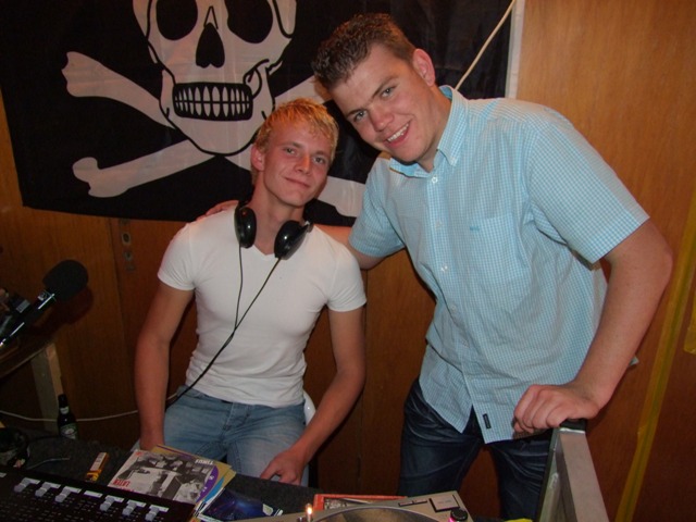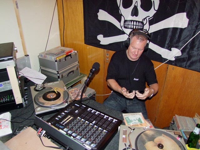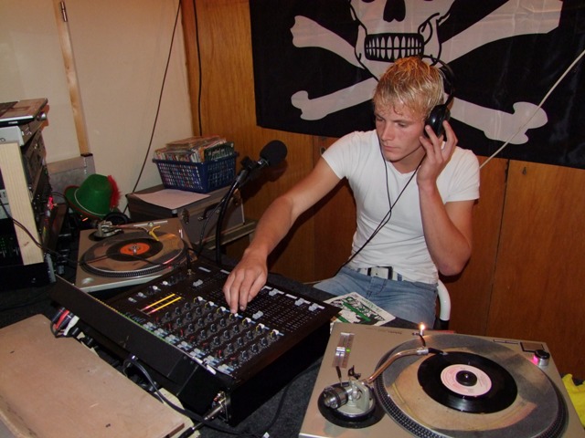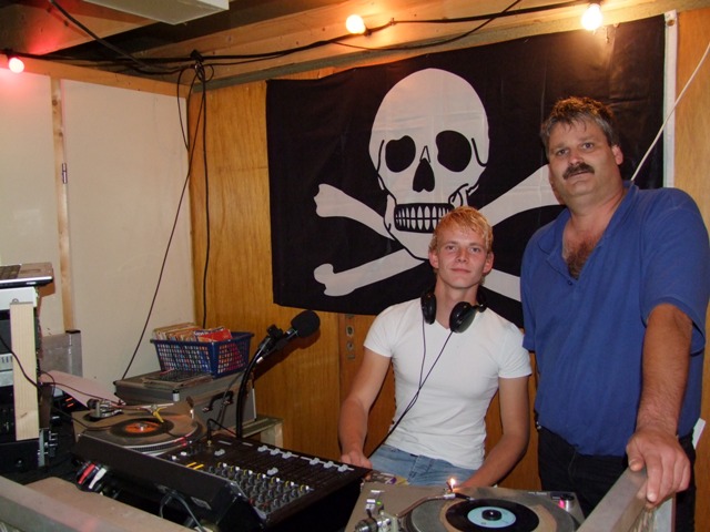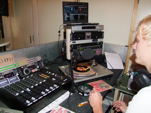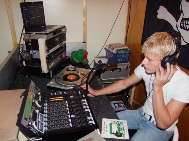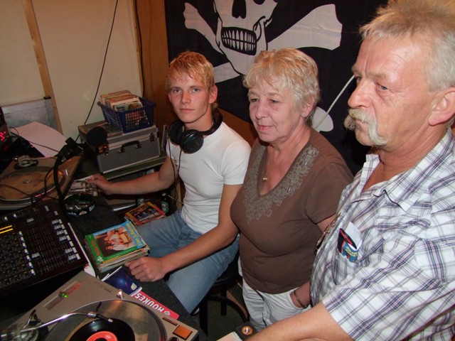 In de studio is het wel anders. Daar is meer rust maar wat dat is niet verwonderlijk. Met de laatste zonnestralen van de nazomer wil iedereen buiten zijn, maar de dienstdoende piraat staat heerlijk zijn plaatjes te draaien. Deze piraat komt me wel heel bekend voor. Het is mijn overbuurjongen. Vol trots laat zijn vader het hele spul zien.