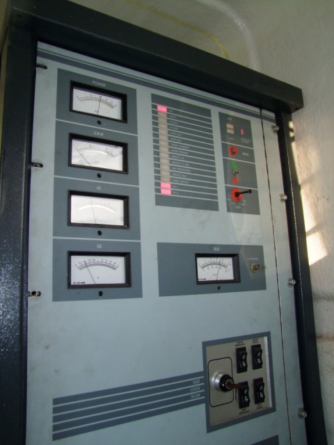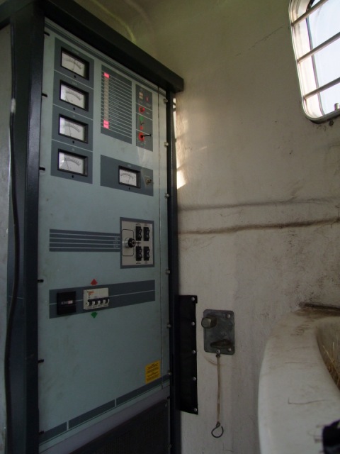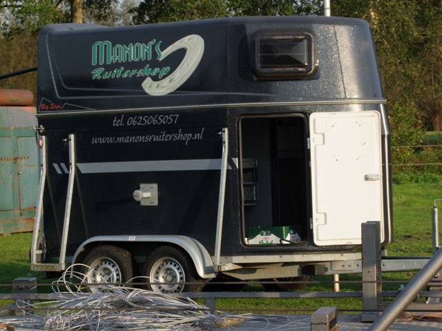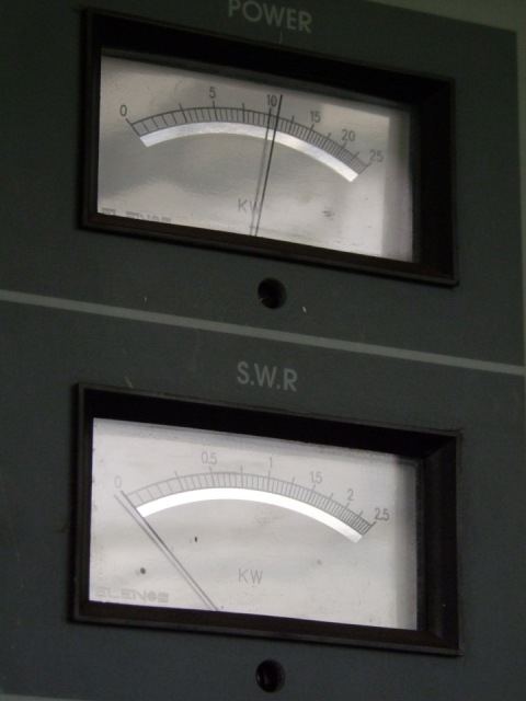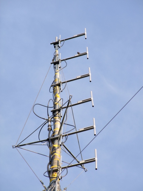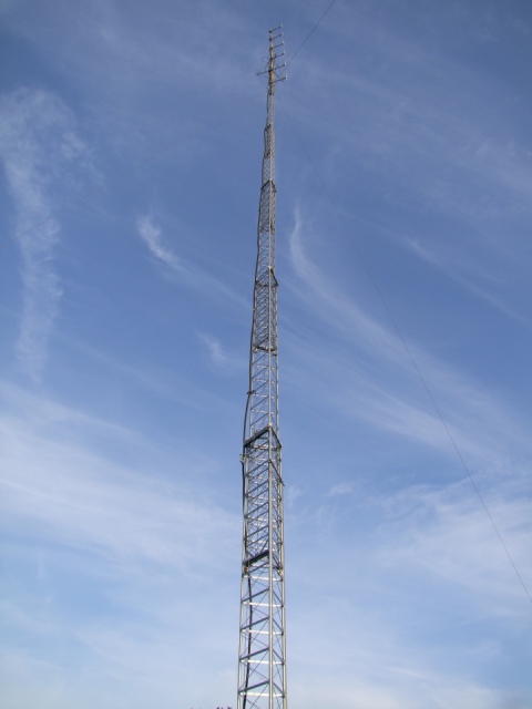 Voor de mast moeten we een stukje rijden maar dan komen we op de plek waar het mooie exemplaar van 60 meter staat. Erin hangen zes twee-elements breedbandantennes. De zender staat -hoe kan het bijna anders bij piraten- in een paardentrailer en is goed voor 11 kW op de klok. Het gaat om een Elenos T10.000.